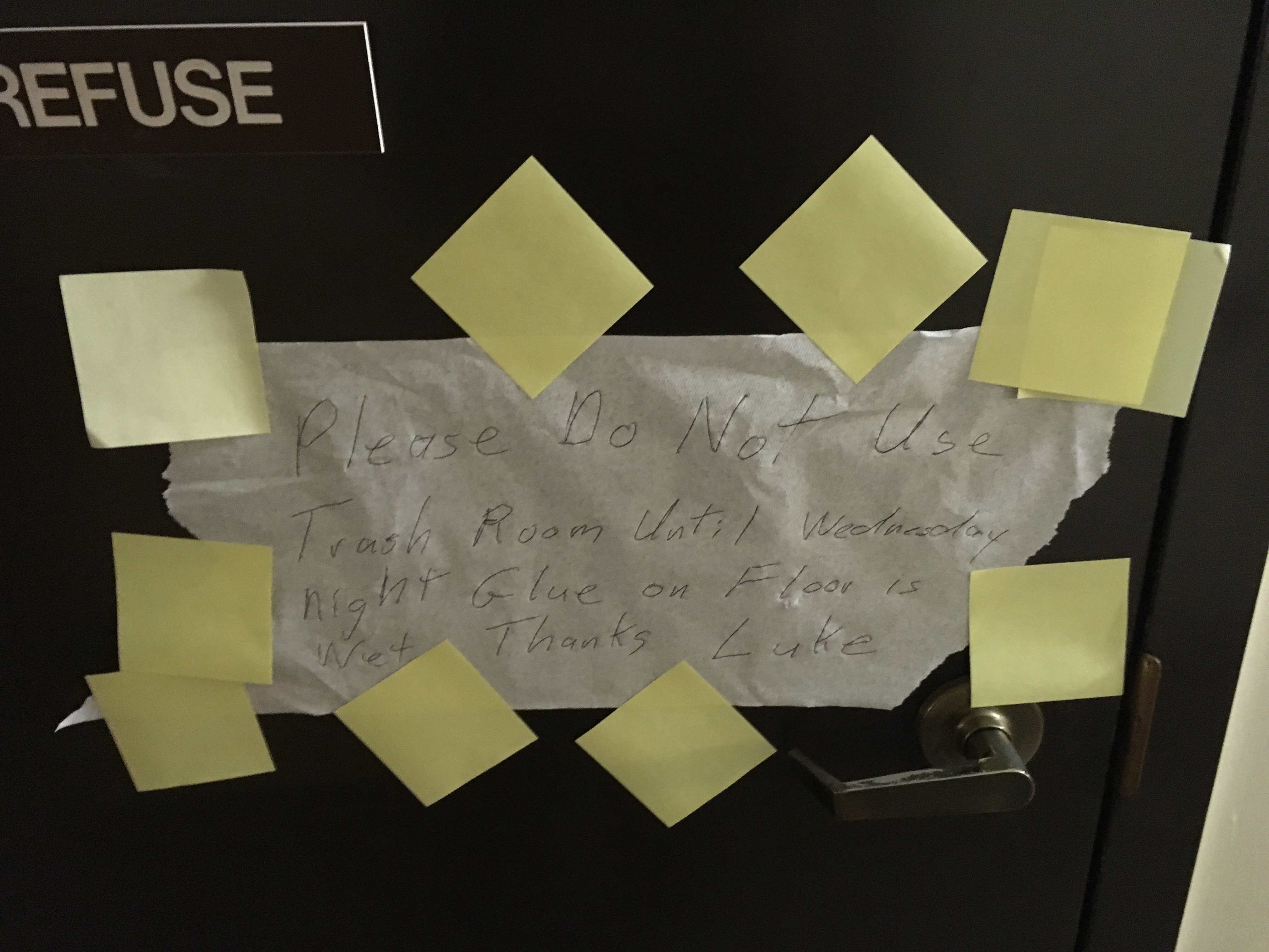 What does is say about the state of our economy when maintenance professionals are reduced to paper towels and stick-it notes for the below?