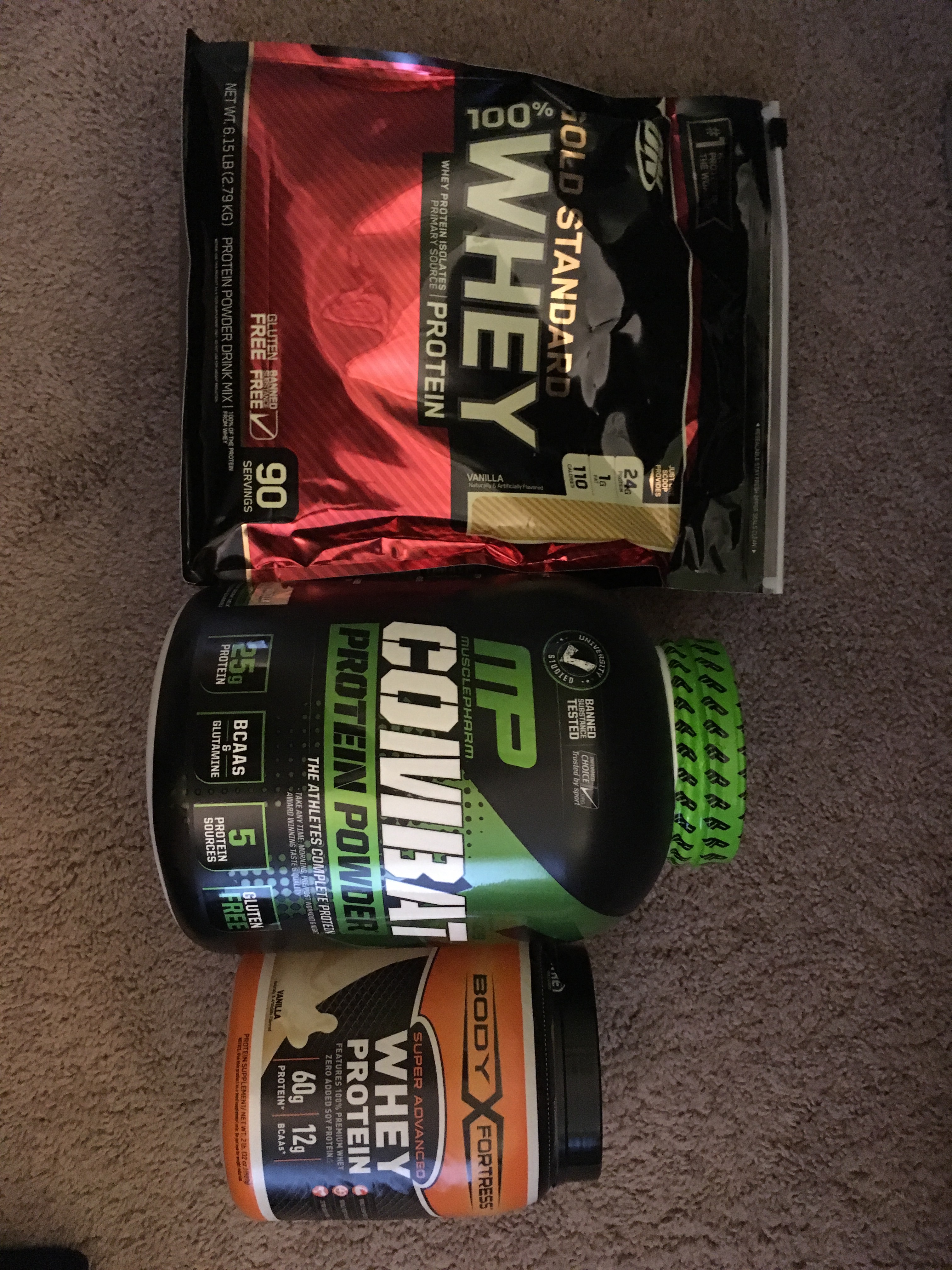 I’ve been doing some hefty, hefty, hefty! research on Whey protein. After comparing each brand at Walmart, Meijer, Trader Joe’s, Target, Costco, and the top twenty brands on Amazon, I’ve found the cheapest Whey per gram of protein. In this, I also considered cholesterol, sodium, fat content, total calories, and have looked into legal actions regarding protein spiking and prevalence of heavy metals based on independent third party tests (www.labdoor.com proved a helpful resource). I’ve also taken into consideration number and quality of reviews on Amazon and BodyBuilding.com. Based on all of these factors, I’ve found that the Whey on the left of the following photo, purchased at Costco (online sources are more expensive) is the best option based on all criteria. The second best option was the Combat formula in the center, purchased from Amazon. I also appreciate how the Combat container is in the color theme of Xbox’s Halo series. I found that there is a soy product at TJ’s that is cheaper than all of these on a per gram basis and has low cholesterol, sodium, calories, and high nutrition; however, I’m skeptical that soy provides the same benefits as Whey. The Body Fortess brand on the right was a fluke and should not be purchased – cholesterol, much like rent, is too damn high.