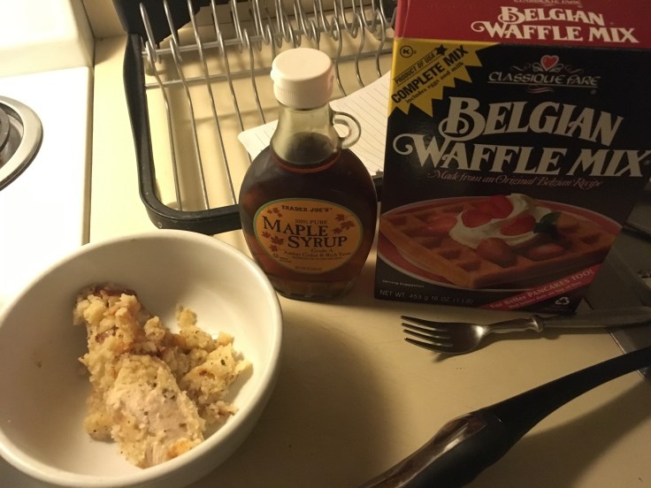 Just a quick idea for those getting back at 1am and in need of some tasty protein (I’ll let this one go…). Cook frozen, skinless boneless chicken tits in the pot on medium in vegetable oil and cover for twenty five minutes, flipping occasionally. Then, cut the chicken now that it’s unfrozen and cut into tiny pieces. It’s 1am and you’re home alone, cooking chicken and pancakes…so for the second time tonight, confirm you’re not seeing any “pink” and when you do, pour the pancake batter (mixed with water and more vegetable oil) into the pot around the chicken. Cook for two to three minutes, flip, douse with salt and oregano, cook for another two minutes and voila, you got yourself a tasty, lazy-ass midnight treat. Serve with hot sauce, mustard, or maple syrup.