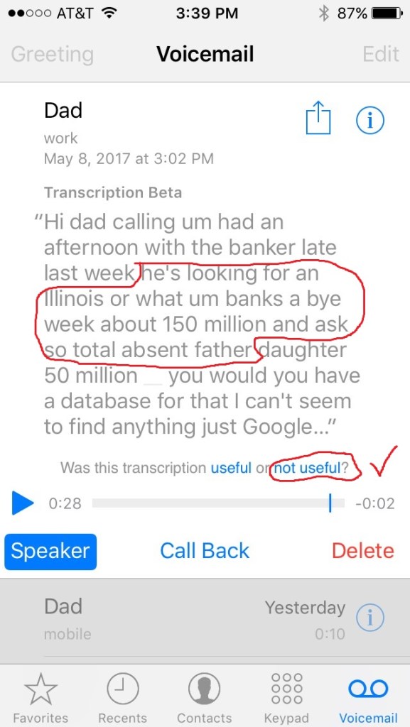 8) This next one is sure to offend! My dad left me a voicemail. Somehow, “he’s looking for an Illinois based bank to buy with about $150 million in assets under management” became the following: