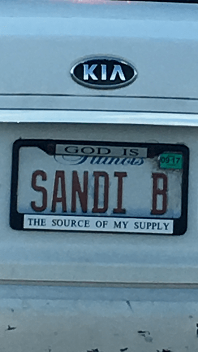 She’s a real slut for Ferrari but then again, so am I. Viva la Ferrari 458!!! Somewhat related, I passed a license plate last night that was DRYPOWDR. My erection grew three sizes that day. That’s all for today. Though I did come across this license plate holder from Sandi in Illinois (trigger alert: it’s a Kia):