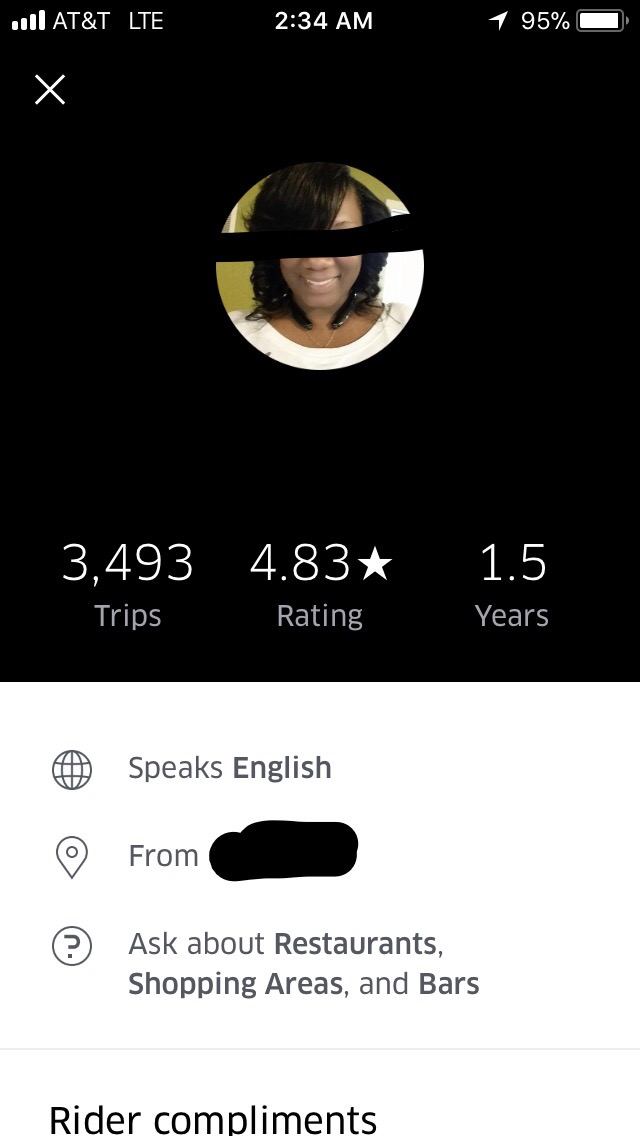 A) Sorry to block out the location info. It is Uber, so she’s not in London. It is not an UberBoat, so she’s not in Puerto Rico. There is a functioning street lamp, so she’s not in North Korea. She does speak English, so she’s not in Miami or SoCal. She is driving, so she’s not in Saudi Arabia (for now). She does like restaurants, so she’s not in the Upper East Side.
