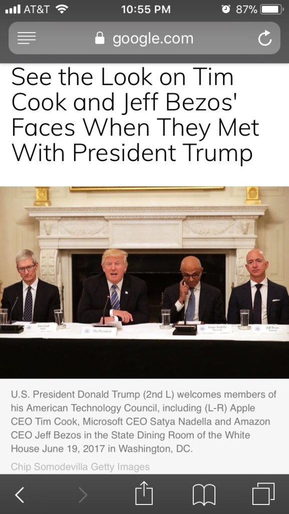 It’s clear to me that none of the three gentlemen accompanying our Clementine-in-Chief wants to be there. Especially Tim Cook, who you can tell is at the edge of his seat, squirming on his chocolate starfish. Tim wants nothing to do with the American Technology Council, although I’m guessing that wouldn’t be the case if Mueller probed them too.