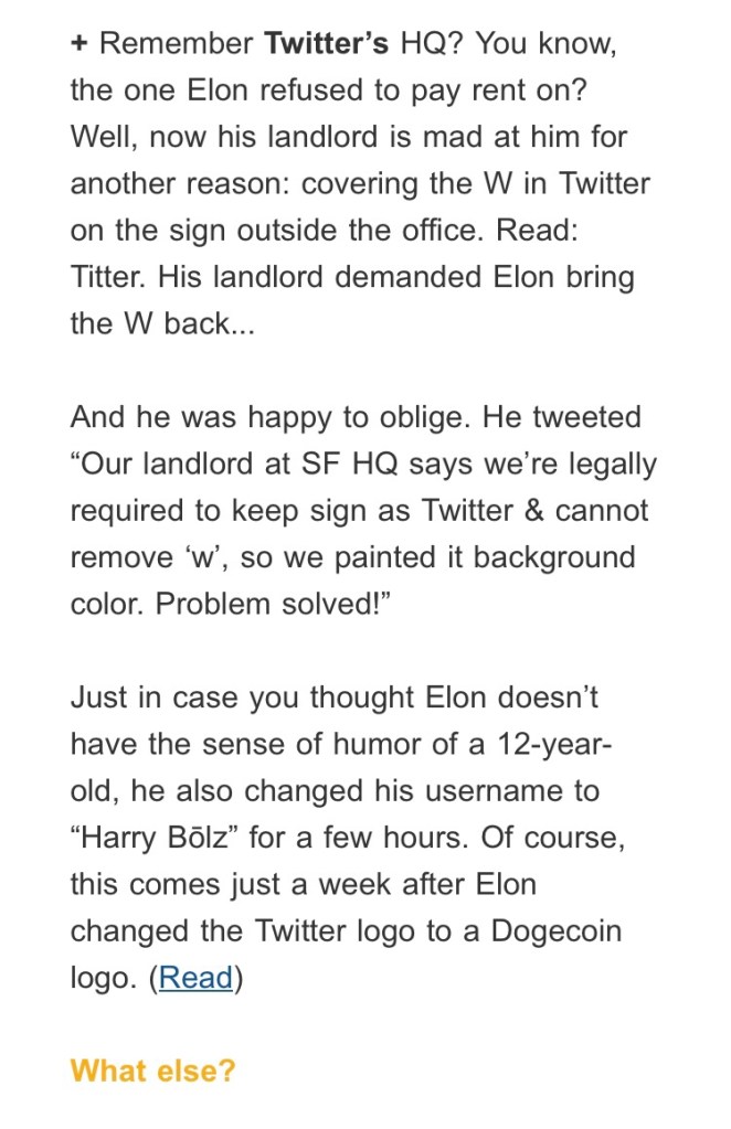 Today we begin with a few quick songs of the day. The first song is INCREDIBLE. So damn catchy, it’s Don’t Wake Me Up by Chris Brown. The guy hits every note and just when you think it can’t get any better, the autotune punches in for a bruising chorus. Stupendous song. Dude has a lot of passion. The next song of the day is a throwback, it’s Do You Really Want To Hurt Me by Culture Club. Next up is another throwback: Gypsy by Fleetwood Mac. Really a great song and perhaps under appreciated? I don’t know, it sounded profound when I wrote it. And finally, this next song is INCREDIBLE. Just as good as the Chris Brown hit but a different genre. It’s Motorcycle Drive By by Zach Bryan, the man who was so nice they named him twice.